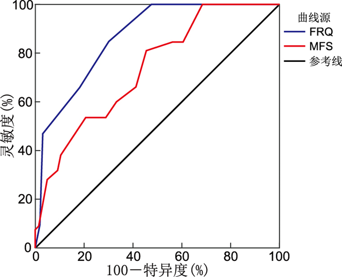 组别 例数 FRQ MFS 跌倒组 32 5(4, 6) 60(40, 75) 未跌倒组 161 2(1, 4) 35(15, 55) Z值 6.602 4.241 P值 <0.001 <0.001 表 3 最佳临界值下FRQ与MFS对PMOP患者跌倒风险的预测价值